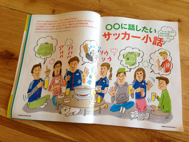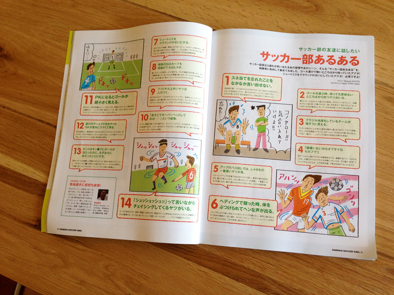 © 2012 teppei nakao. All rights reserved. SAMURAI SOCCERKING 2012年12月号 14 11月 ’12 描いてます。サッカー小話〜あるある的な?小中とサッカー少年でしたが、高校に入りサッカーしてる友達がチャラく感じ帰宅部になりました。そのままの偏見を持ったまま昨今まで至ってます。サッカーに罪は全くありません。チャラいイメージを植え付けた友人にも・・・ただ、何かまたやろうかなぁという気持ちになれないだけなんですねぇ〜中学のときのパイセンからのしごきがマジでムカついたからかなぁ・・・頑張れニッポン☆ SAMURAI SOCCERKING 2012年12月号